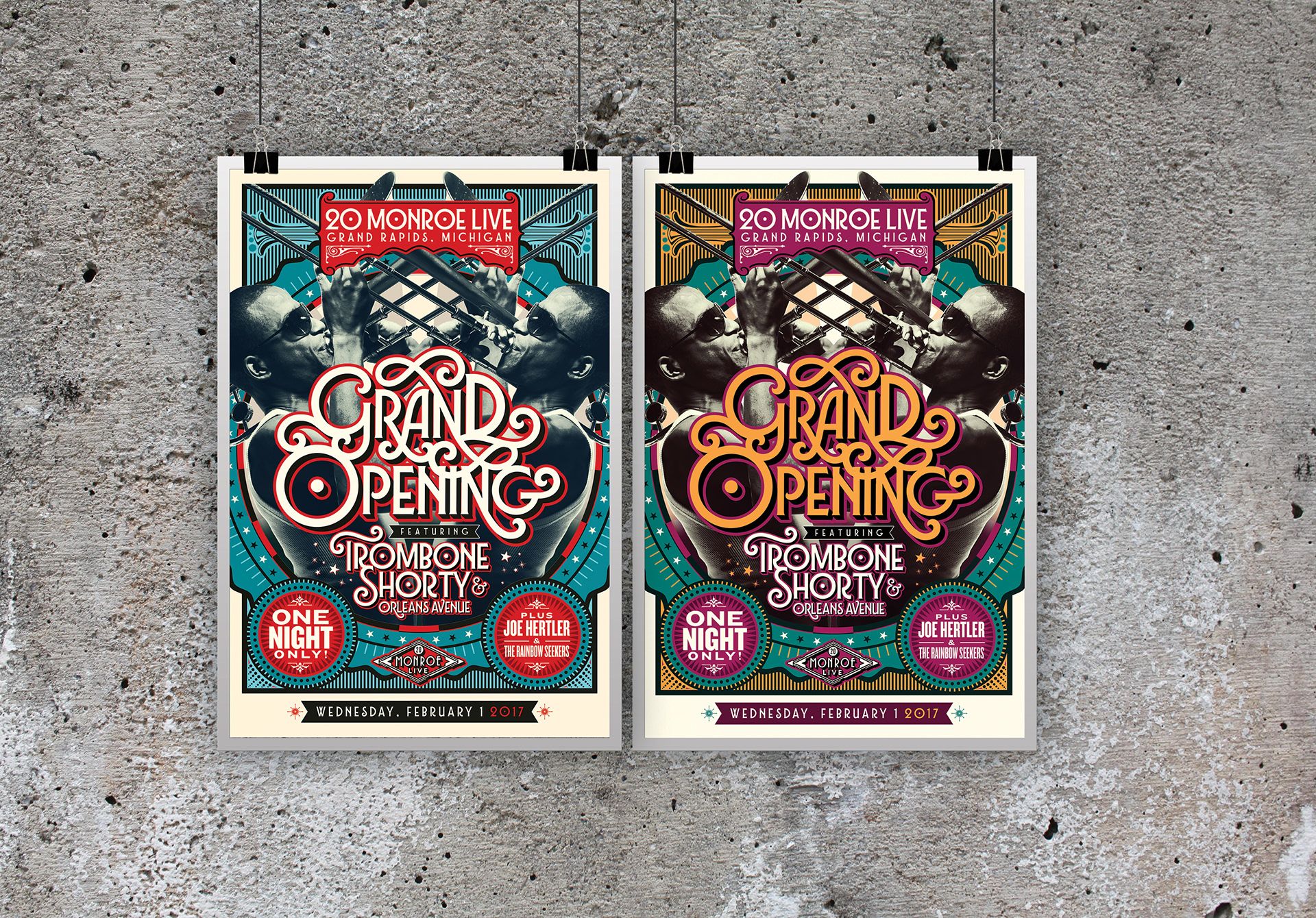 Poster for the Grand Opening night concert at 20 Monroe Live in Grand Rapids, MI.